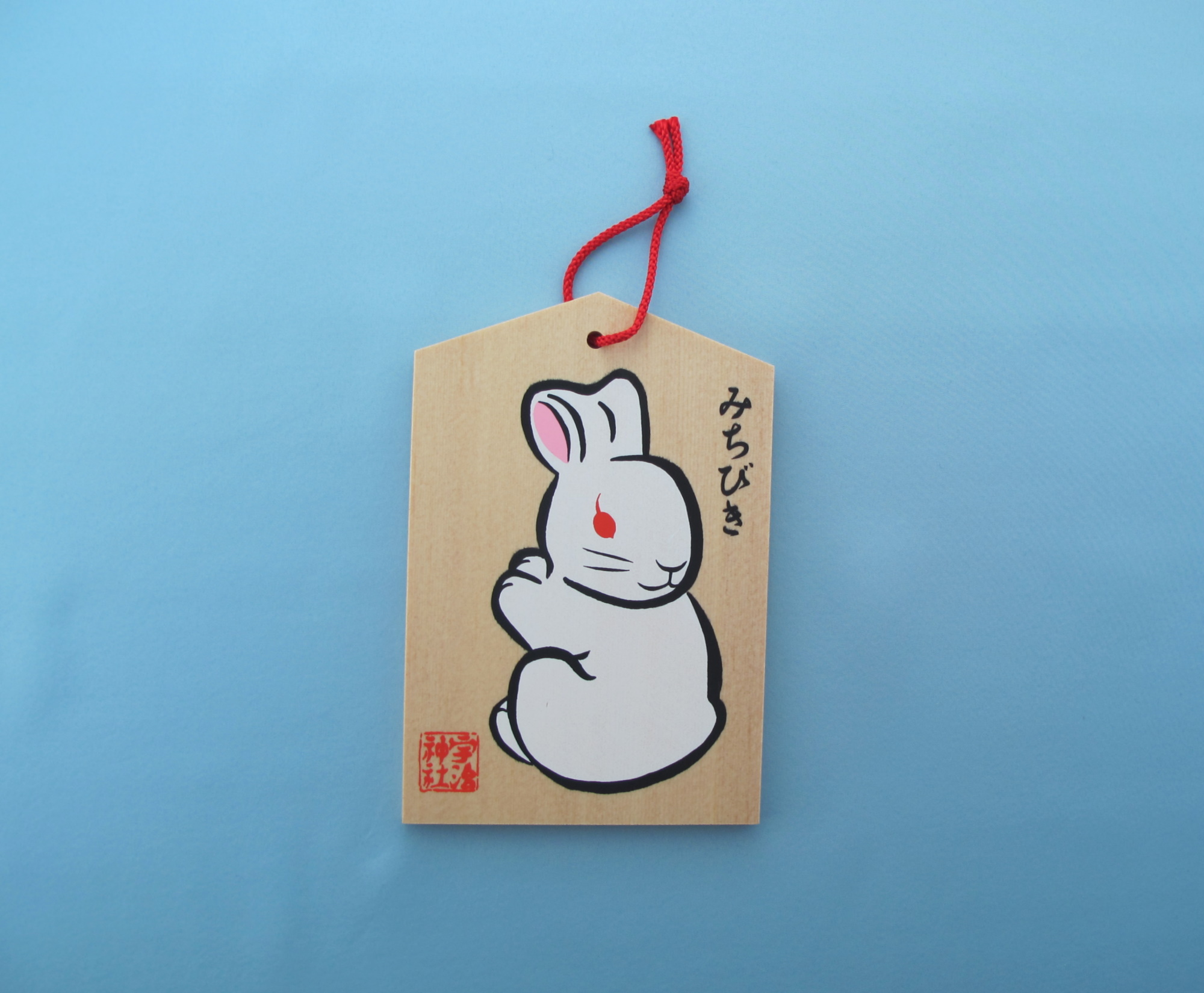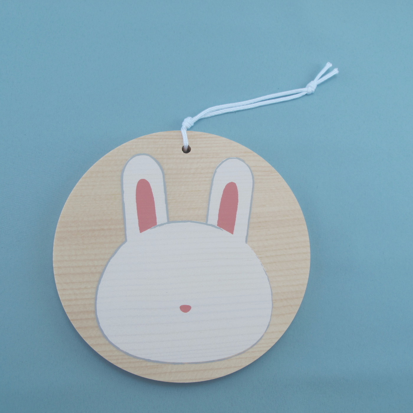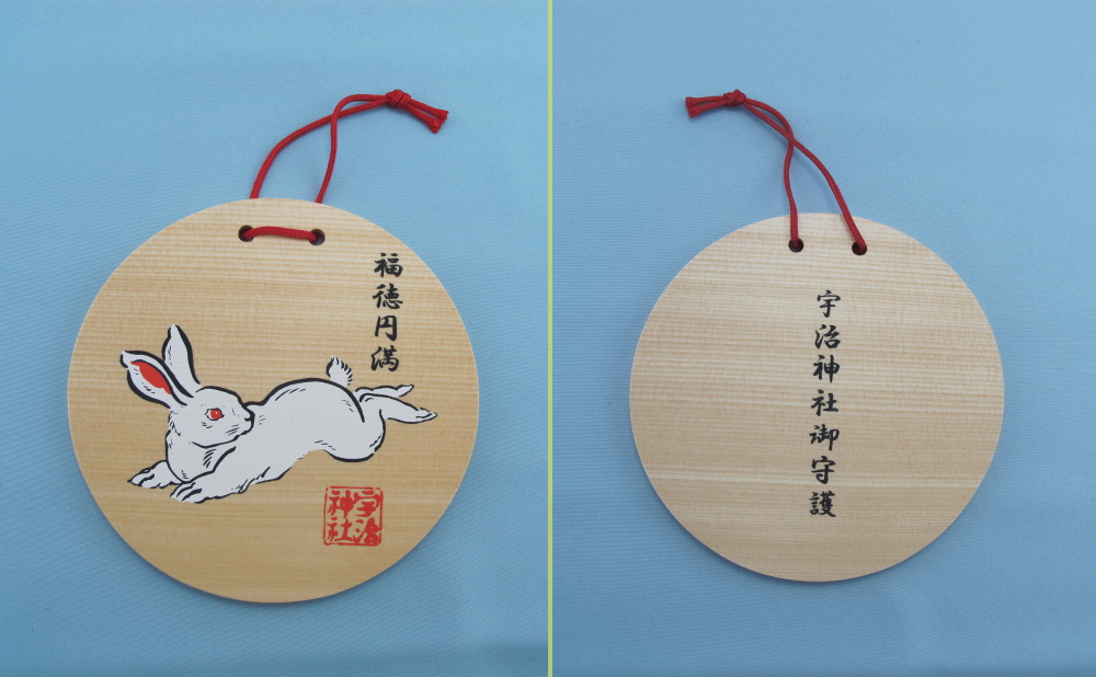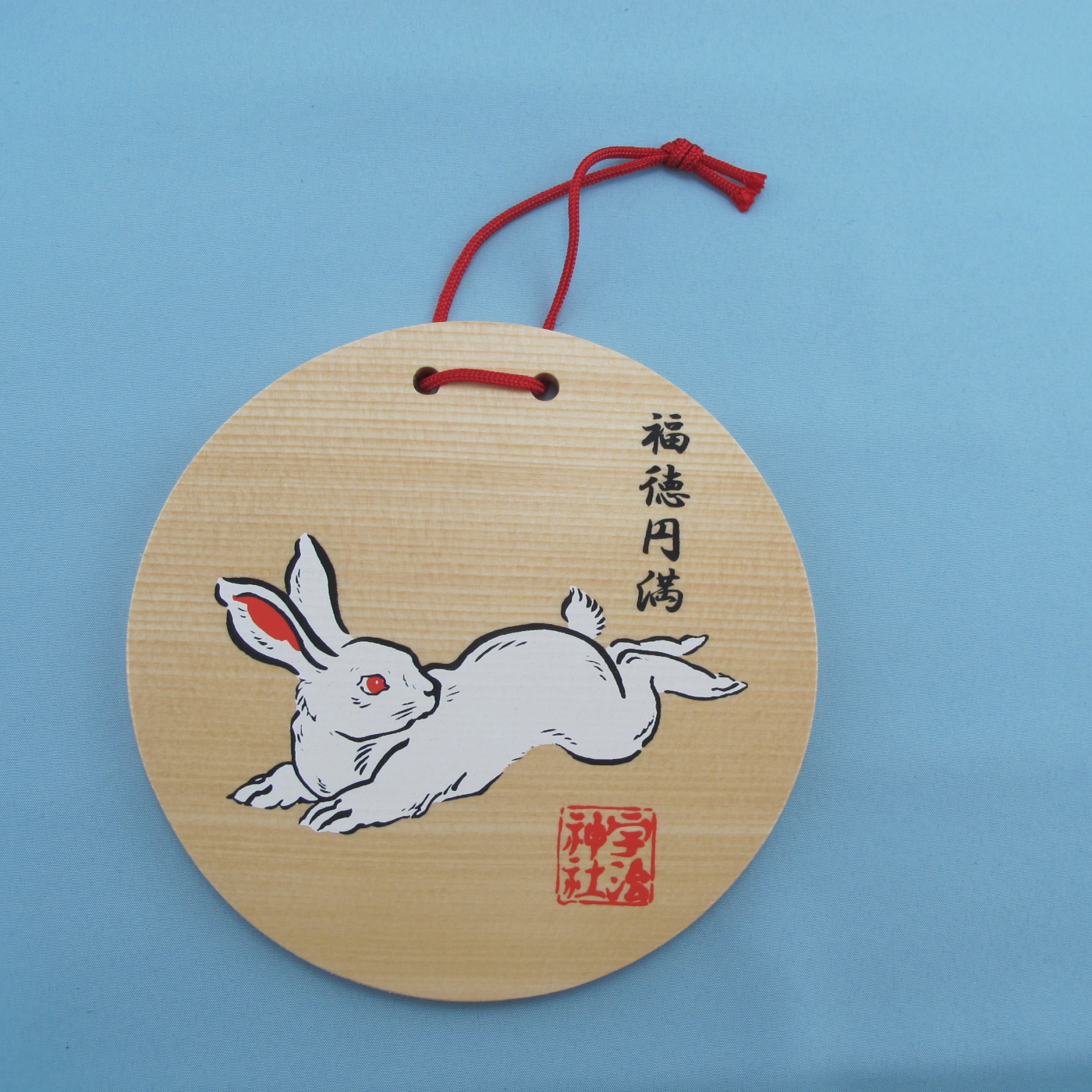 当神社の御祭神を道案内しお助けした神使のうさぎ「みかえりうさぎ」が描かれ、室内ではなく屋外にお祀りする、めずらしい丸型の木札です。