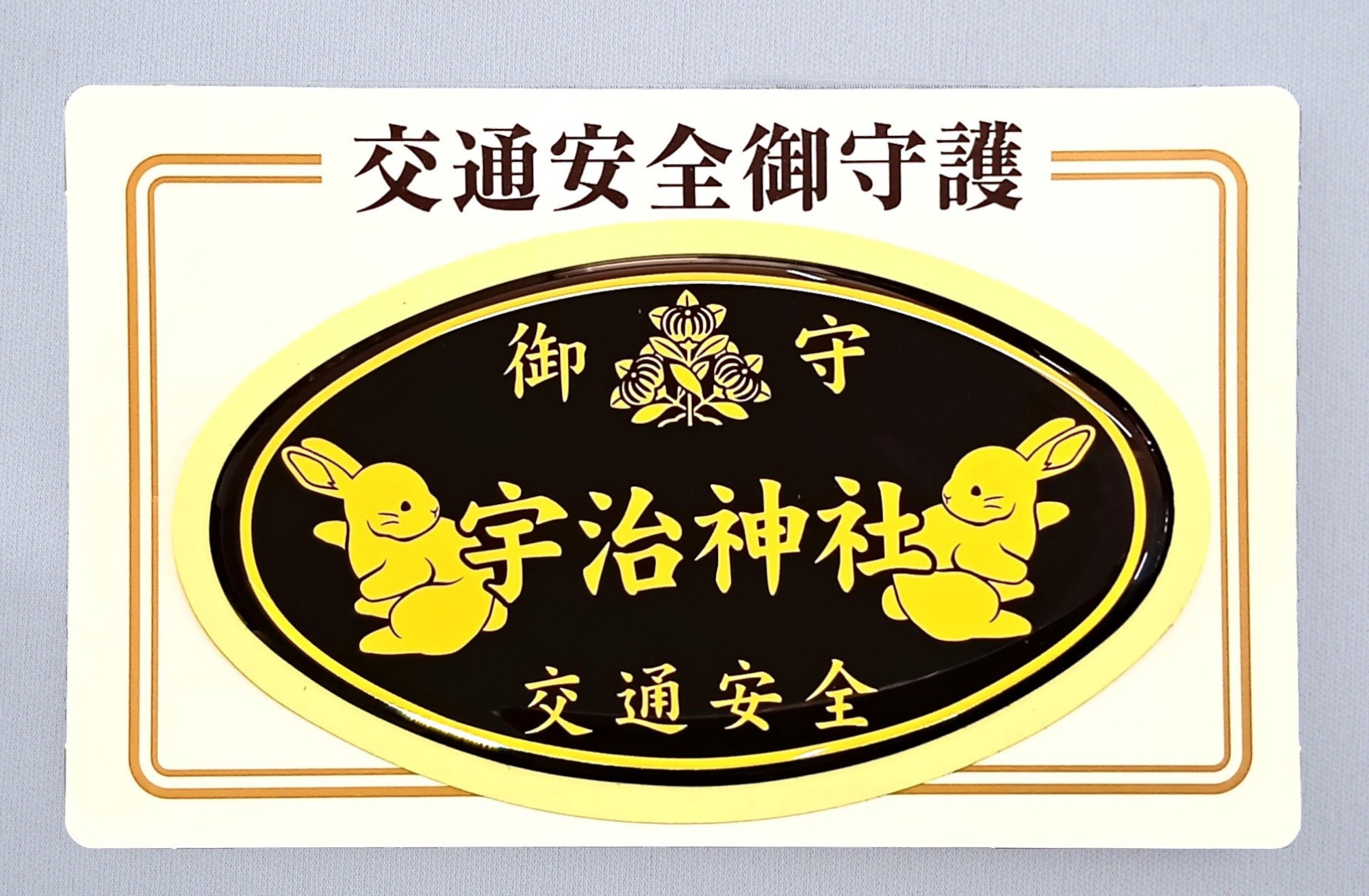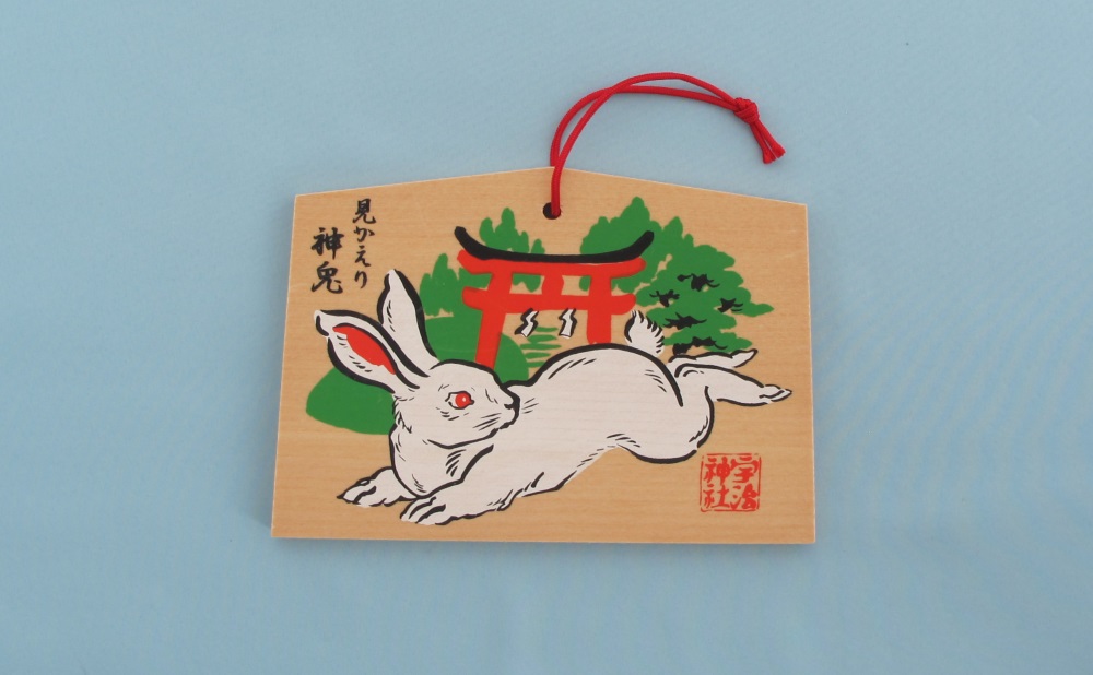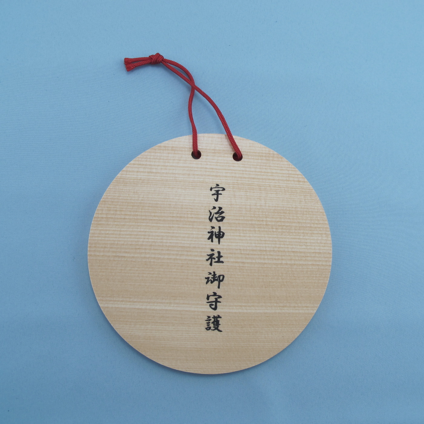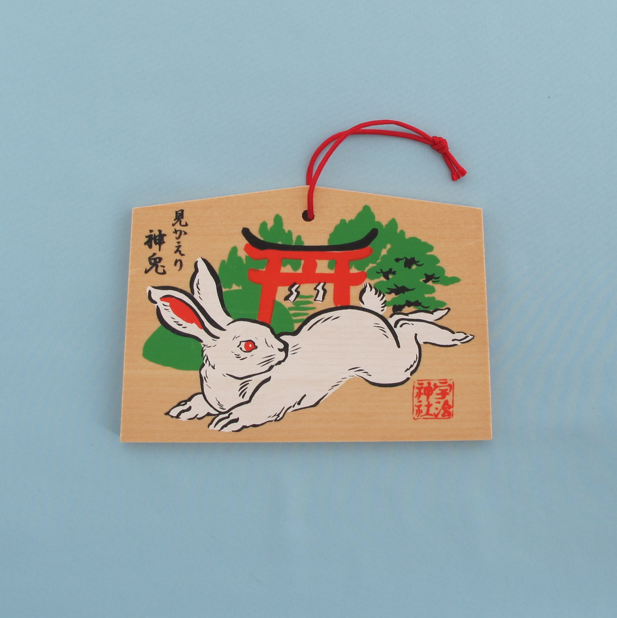 当神社の御祭神を道案内しお助けした神使のうさぎ「みかえりうさぎ」が描かれ、室内ではなく屋外にお祀りする、めずらしい丸型の木札です。