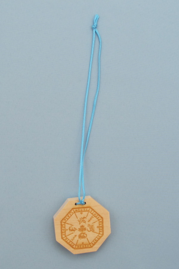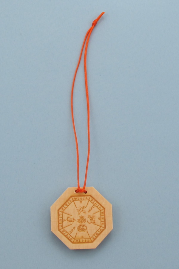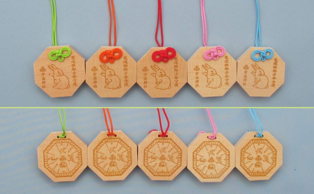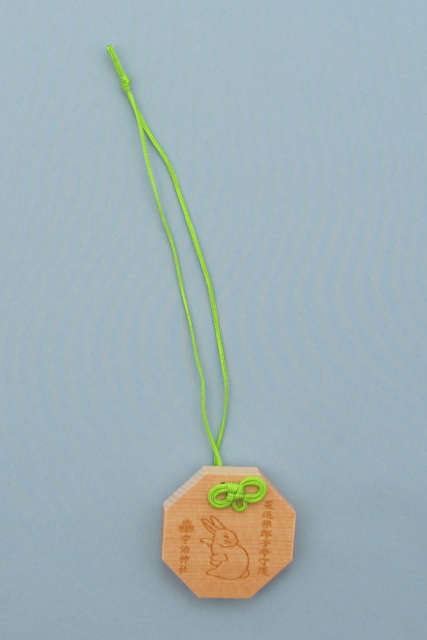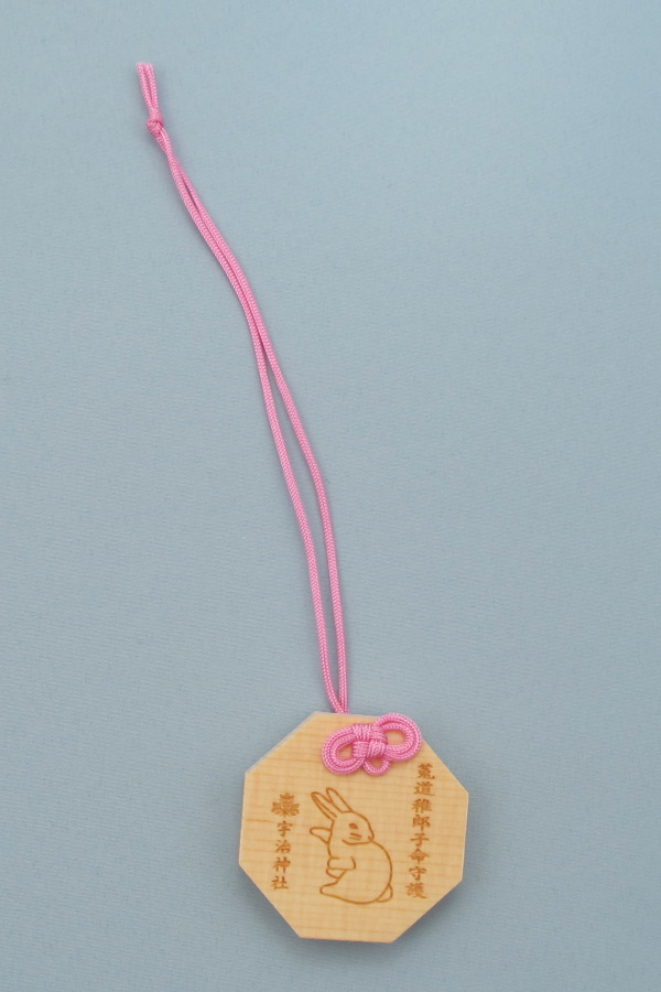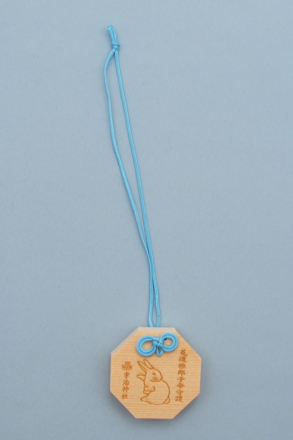 表に描かれた「みかえりうさぎ」が幸せな日々へと導き、裏に描かれた「方位盤」により、四方八方からくる災いを祓い除け、日々穏やかにすごせるよう祈願した八角木守です。