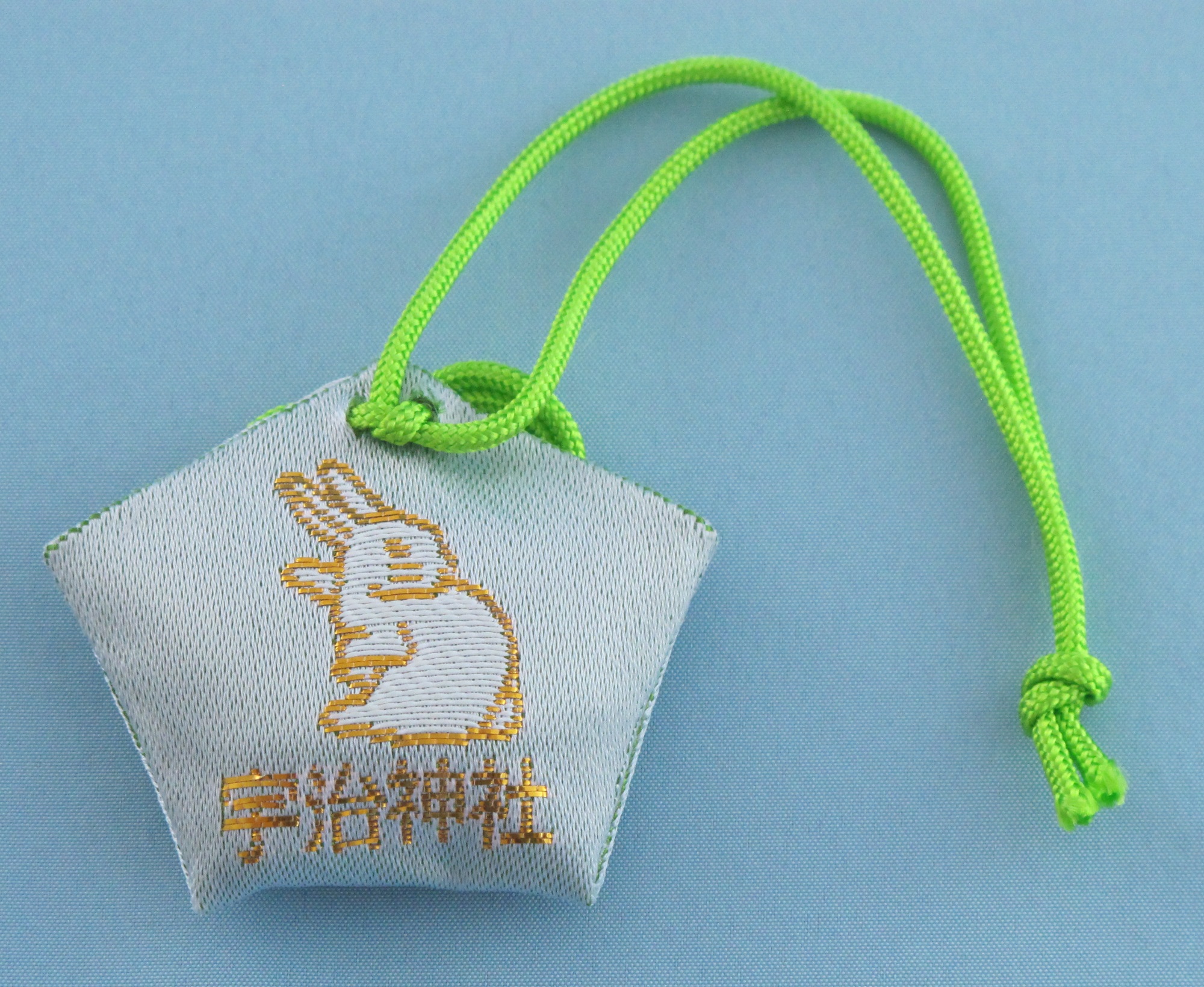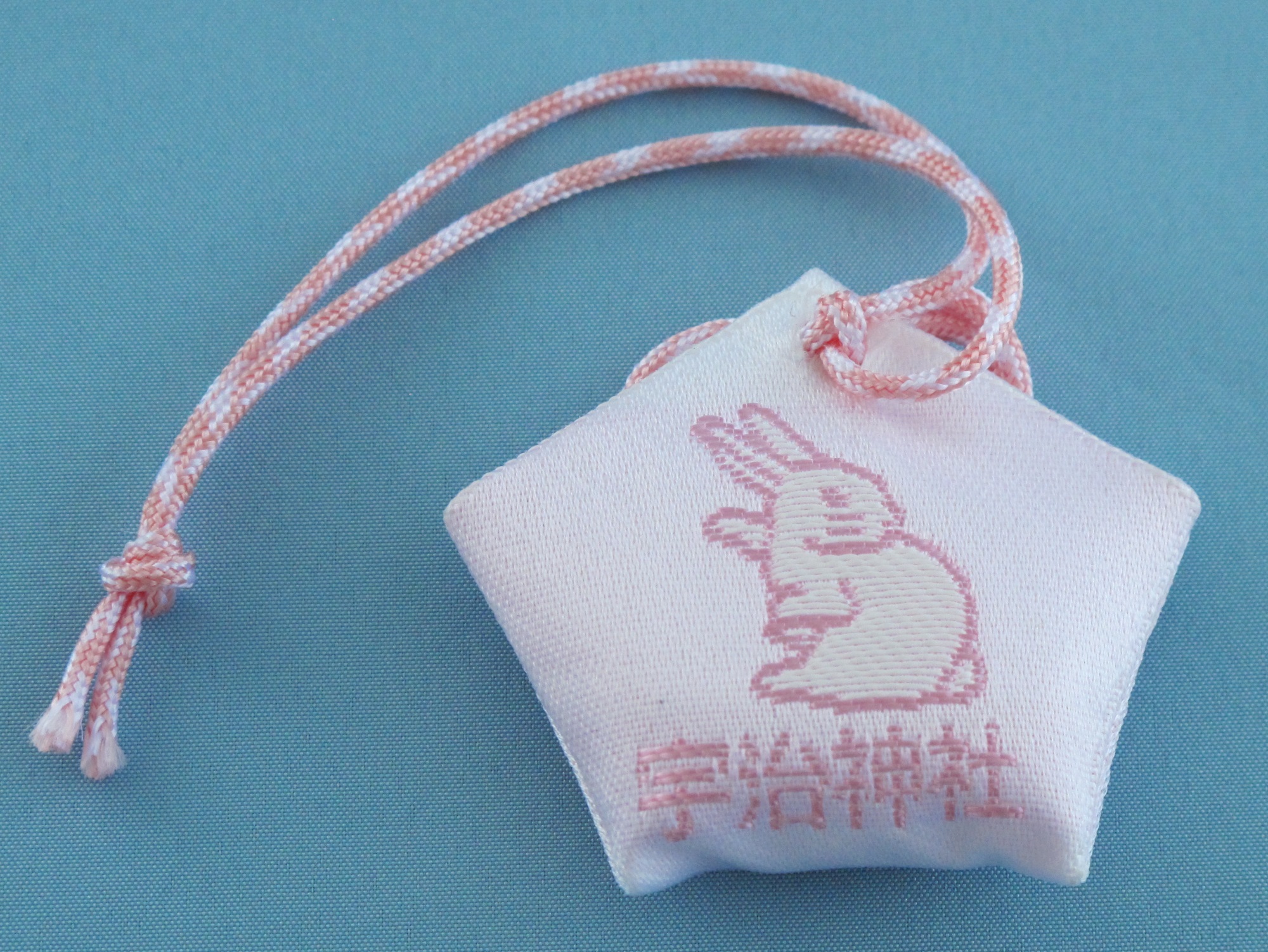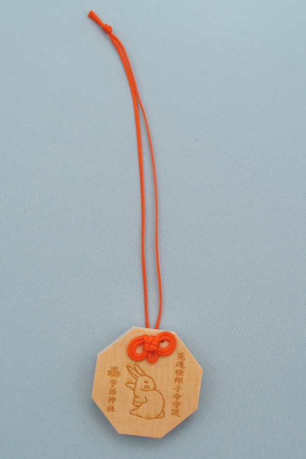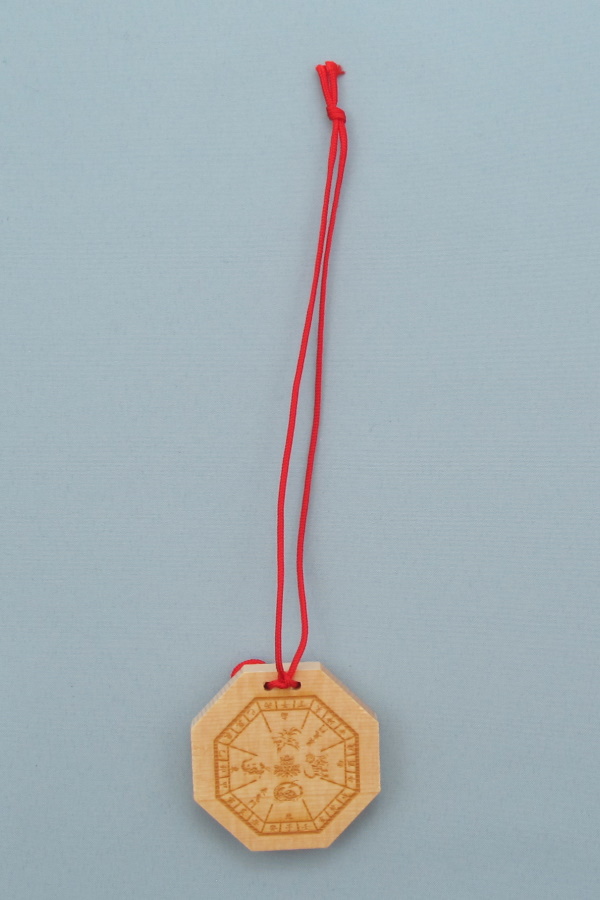 表に描かれた「みかえりうさぎ」が幸せな日々へと導き、裏に描かれた「方位盤」により、四方八方からくる災いを祓い除け、日々穏やかにすごせるよう祈願した八角木守です。